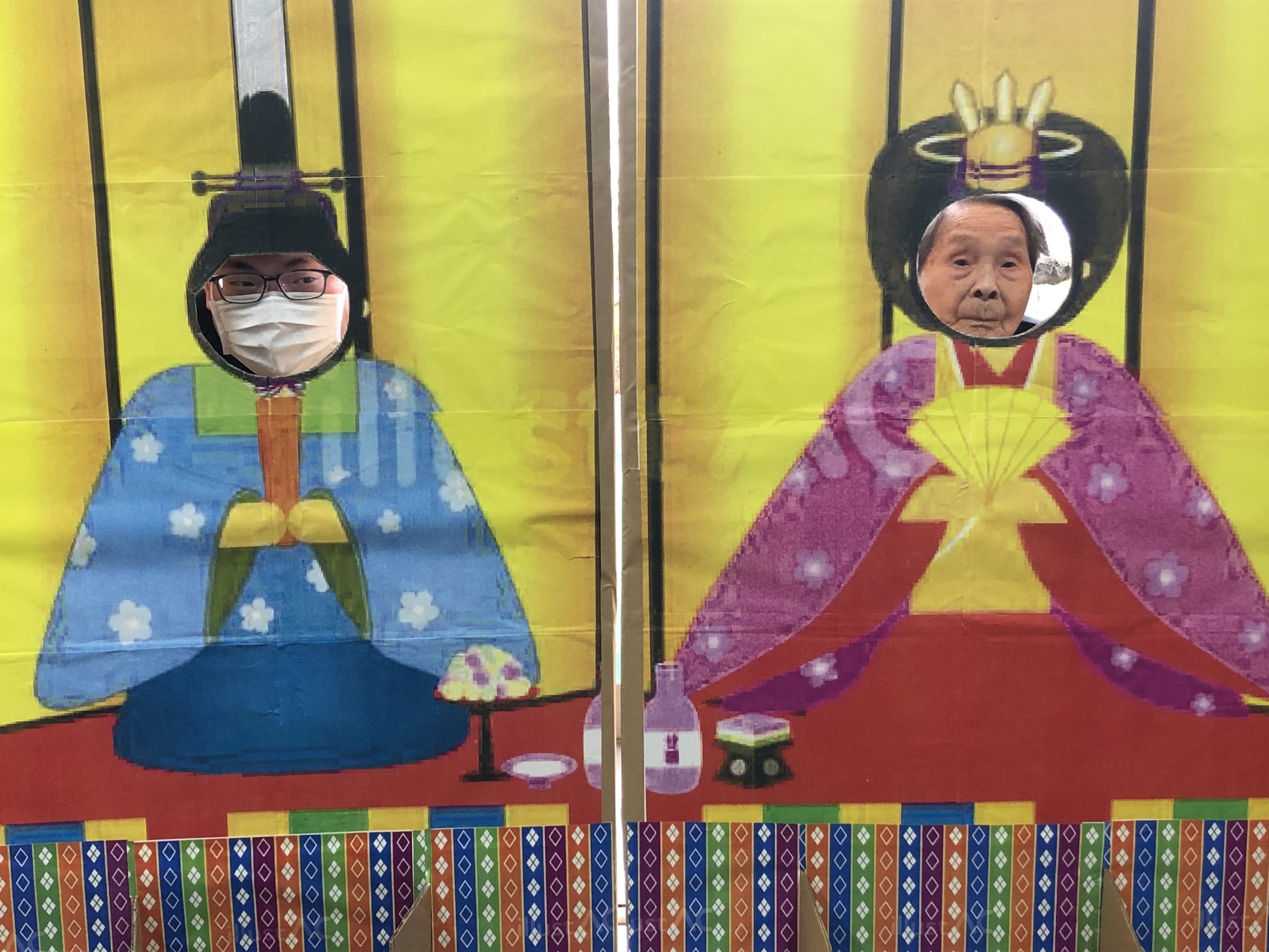 ひな人形と順番に写真撮影した後は、職員手作りのパネルに皆さん順番に顔を入れてパチリ📷